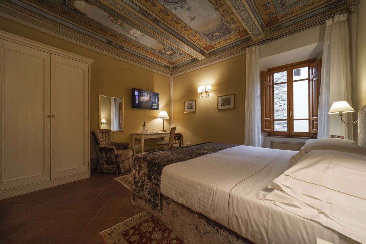 Elegant, spacious and comfortable double bedroom, furnished in style with modern services with cotto pavements. All the Superior rooms have mirror, writing table, luggage stand, table, arm chair, wardrobe, sat TV LCD, safebox, minibar with free water, direct telephone, heating and air conditioning.