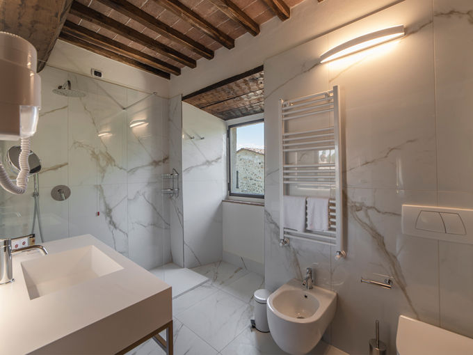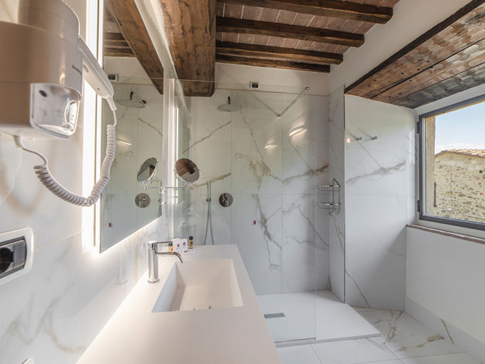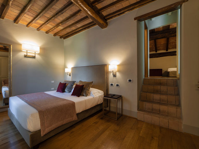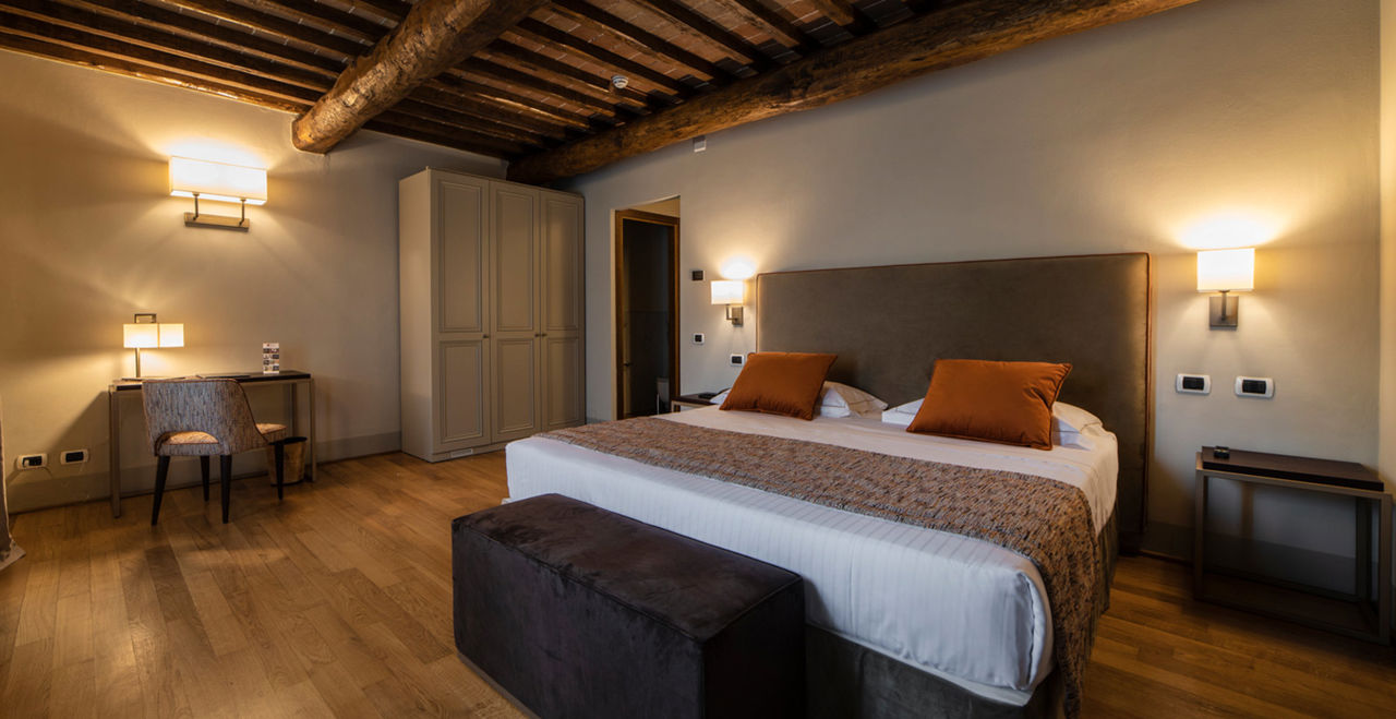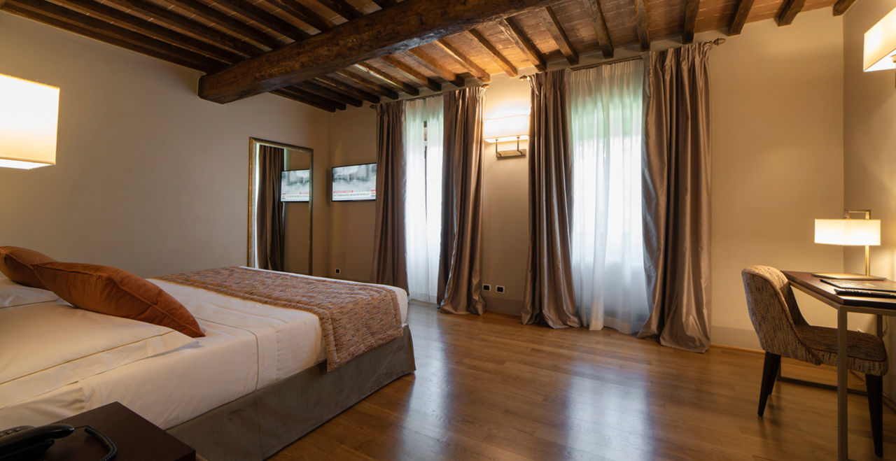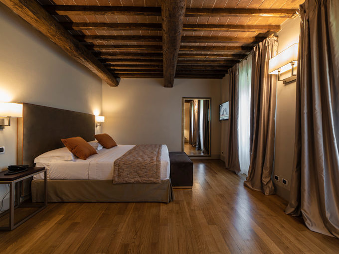 Nella camera è presente un’ampia specchiera, una scrivania, uno spazioso armadio, una smart-TV satellitare 40”, una cassaforte, l’aria condizionata e un telefono diretto. Nei bagni oltre alla doccia è presente un grande specchio luminoso, un set di cortesia, un asciugacapelli e una presa americana. La connessione WiFi è disponibile in tutte le camere, oltre che nelle zone comuni del Relais.