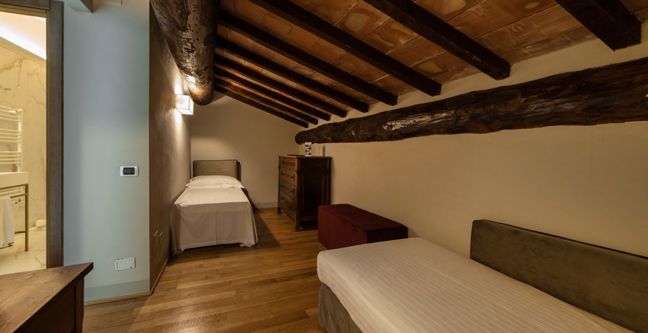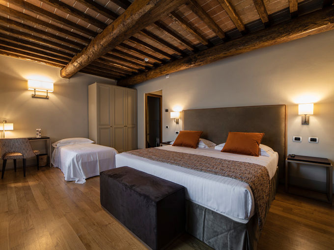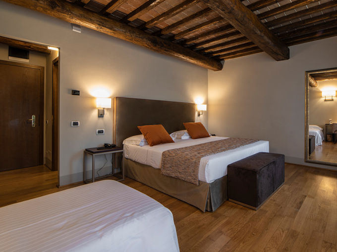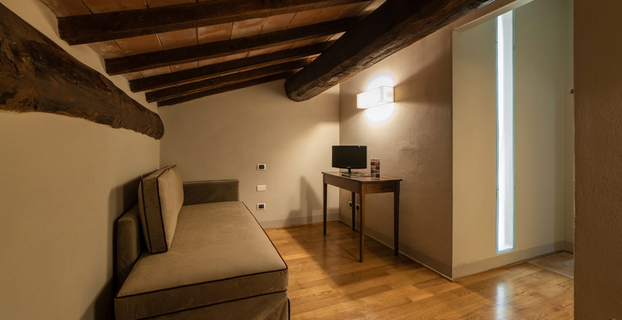 La Camera Family è una camera molto spaziosa, perfetta per una famiglia di quattro persone, ha un arredo contemporaneo con chaise longue e terzo letto ed è distribuita su due stanze; affaccia sulla corte interna del Relais.