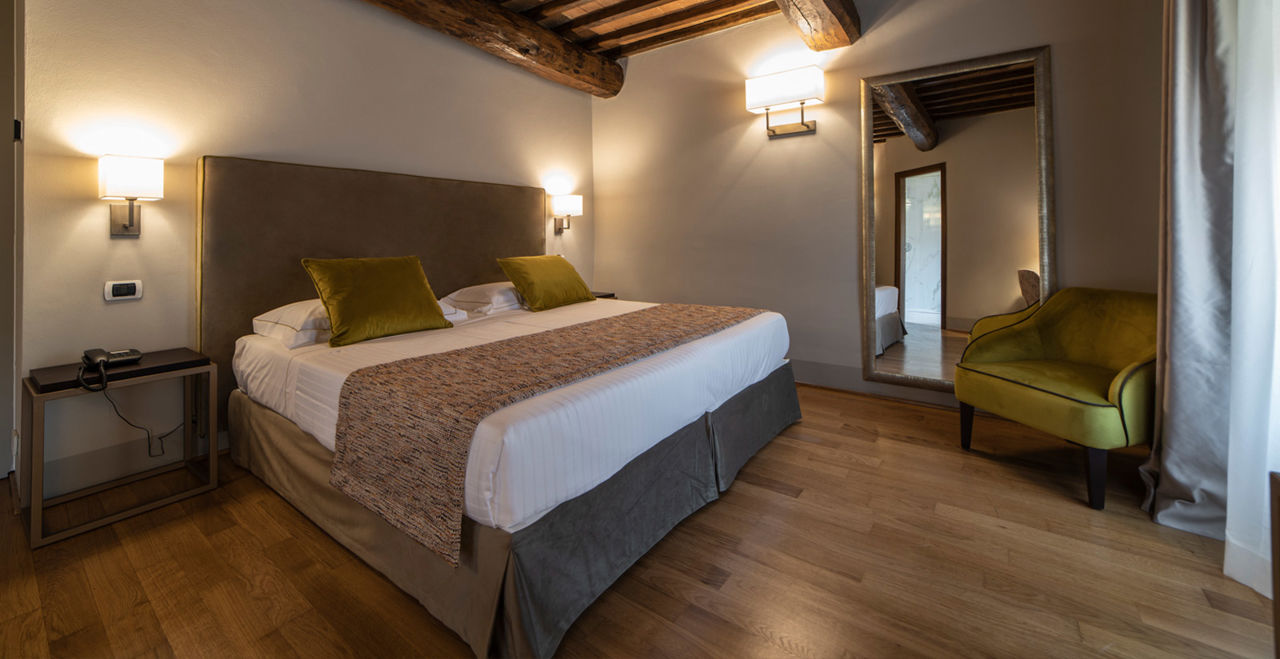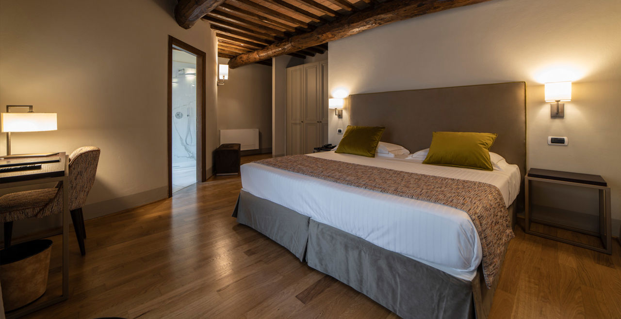 Le camere Superior sono ampie e luminose con un arredo contemporaneo. Il pavimento è in parquet e la vista è sul parco o sulla corte interna.